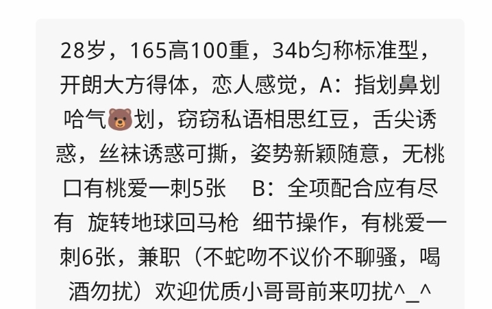 常规服务,不过喜欢玩制服诱惑,比较放得开,平常也喜欢发制服漏网装的图片,喜欢服务的可以考虑,考虑相貌那就算了,年龄可能有30多岁了,颜值只能算是一般