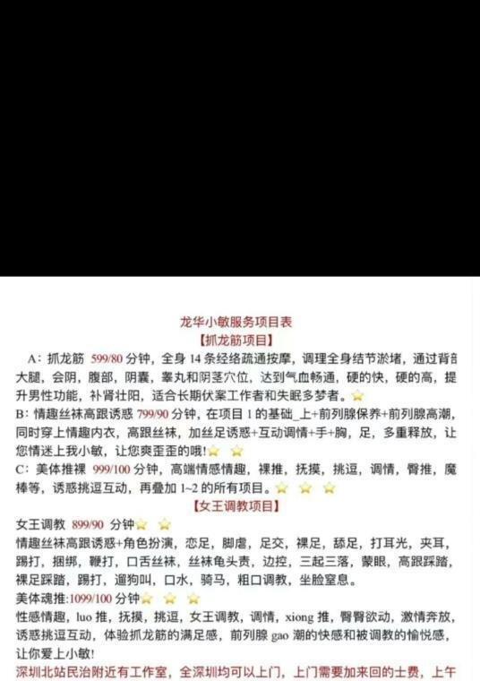 服务项目: 抓龙筋 丝袜诱惑 裸推 女王课程