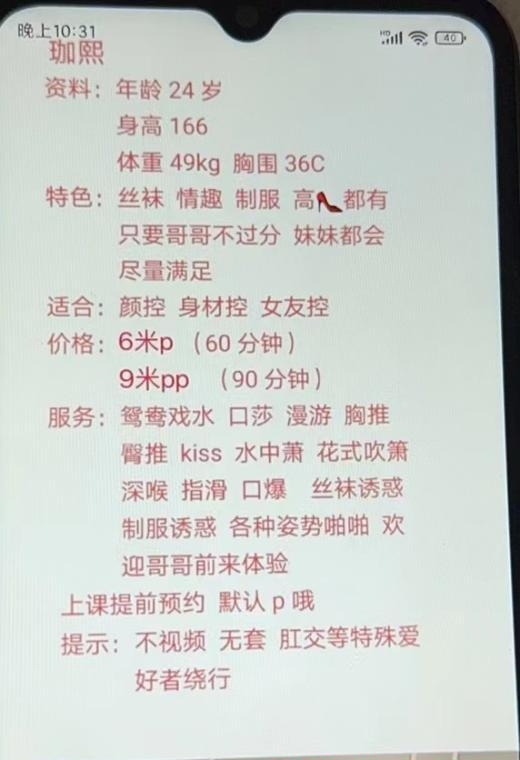 本人比照片好看,有一种少数民族的感觉,胸一个手握住刚刚好,尺寸很合适,服务内容不缩水,有制服丝袜可以选,位置也很好找,方便停车,可以接吻。强烈推荐狼友们冲。