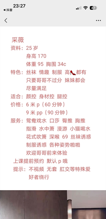 朋友介绍的,正好昨天没事去体验课一下!本狼不太会描述,就直接说点重吧! 妹子23岁,个子很高感觉比我还好点,大长腿身材好,打扮的是个御姐类型,服务很配合,臀部手感很好,屁股翘起来特诱人! 按流程进行的,服务中差点没忍住就去了,姿势配合,完了一点也不催人,不机车,妹子的确很不错!但有点高冷的感觉,但不影响我的心情!由于本狼不太喜欢SM重口味服务,所以服务做的常规全套服务!5张就是常规操作,不做sm这这价格可以优惠一张!但提前要和她谈好。 做sm就要加一张!这点必须好评!因为憋了好久了,和她做了很多姿势,下面水特别多,都流床单上了!妹子奶子很敏感,洗完澡就一直抱着吃大胸,把她整个人都亲软了,胸特别大,抓起来很爽BB很紧!操起来还有水声,叫声很好听! 这就是本狼的体验感受,总体来说除了有点高冷其它服务都不错!最后本狼强烈推荐!