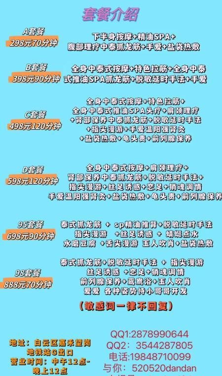 服务项目: 抓龙筋 精油sp 前列腺按摩 丝足 口爆