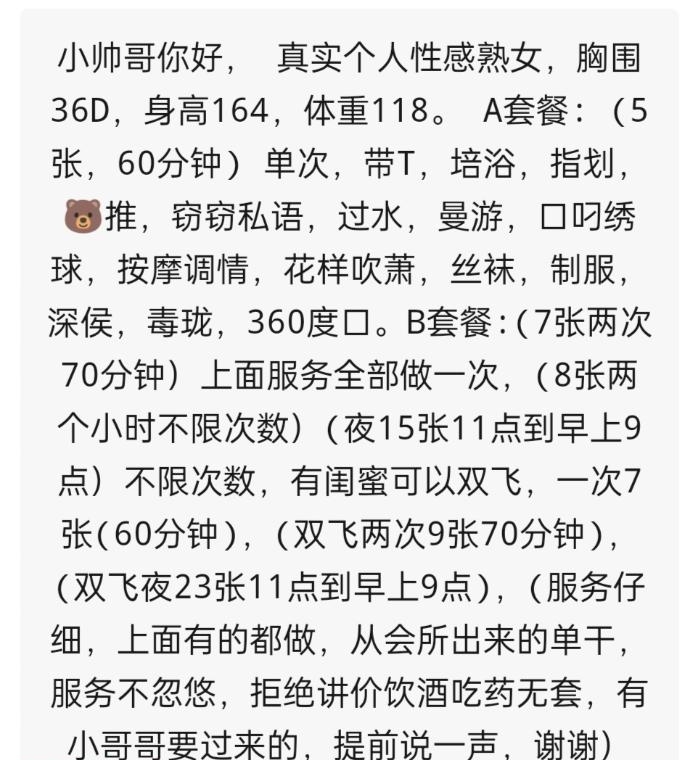 年前约了小姐姐新年回来二刷,服务好照片比人好看,喜欢活好会玩又能玩三通的找小姐姐不会失望,体验满足欢喜而归,价格实惠朋友们去试试吧