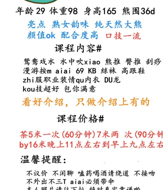 朋友介绍的,正好昨天没事去体验课一下!本狼不太会描述,就直接说点重吧! 妹子23岁,个子很高感觉比我还好点,大长腿身材好,打扮的是个御姐类型,服务很配合,臀部手感很好,屁股翘起来特诱人! 按流程进行的,服务中差点没忍住就去了,姿势配合,完了一点也不催人,不机车,妹子的确很不错!但有点高冷的感觉,但不影响我的心情!由于本狼不太喜欢SM重口味服务,所以服务做的常规全套服务!5张就是常规操作,不做sm这这价格可以优惠一张!但提前要和她谈好。 做sm就要加一张!这点必须好评!因为憋了好久了,和她做了很多姿势,下面水特别多,都流床单上了!妹子奶子很敏感,洗完澡就一直抱着吃大胸,把她整个人都亲软了,胸特别大,抓起来很爽BB很紧!操起来还有水声,叫声很好听! 这就是本狼的体验感受,总体来说除了有点高冷其它服务都不错!最后本狼强烈推荐!