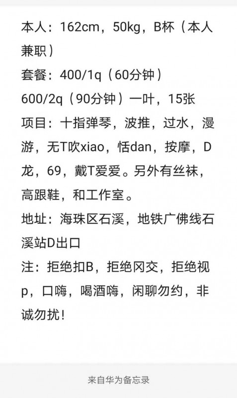 服务有点少,单纯泄火。真人有8分吧,肚子上有点赘肉应该是生过孩子,人比较骚,会主动69且下面无异味比较干净,可以配合任何姿势。有室友可以双飞