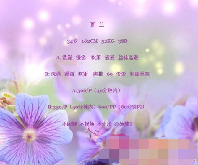 雅安有三绝,雅雨、雅鱼、雅女!我要说的当然是雅女啦,这是我入圈以来遇到的第二个雅女,她可能不是最漂亮但待人态度绝对能在我心中排前三,去年遇到的那个雅女也一样,这是题外话!昨天是周末先去了东站附近结果被忽悠是代聊而且看了三个房间质量都奇差,赶紧溜了!然后就联系了去年就加了的小可爱正好有空,距离15公里果断驱车前往,到了目的地有点小曲折最终还是到达房间,目光扫射一下就知道是我的菜了:个儿大概160,五官标志皮肤白皙,凶器高耸挺拔。说话声音极具亲和力,就像是许久未见面的老友,看人眼神很自然,说话也不像其他大多数老师那样防贼一样提防你。先来了个湿吻然后宽衣共浴,床铺的是那种类似蚕丝褥子躺着要有多舒服就有多舒服,过程中就像家里媳妇似的一点不扭捏你想怎么玩儿就怎么配合你,对我来说耍的是一种感觉,什么感觉?就是恋人相处的那种感觉,自然不做作不演戏,本人最讨厌那种机械似的流程化比如妹子说话让人不舒服或者机车本人瞬间就会失去性趣鸡儿都硬不起来也最来气。小可爱服务做的一般可能不如其他老师,但待人态度很好,给我一种单纯真实亲和力,如果和我一样喜欢态度感觉的她非你莫属了!忘了说小可爱很容易高潮,是真的高潮不是演戏,高潮来了直接坐上来大叫,哈哈!她平时推广是墙外的电报群里,想来能翻墙的LY也是少数这样的极品不应该只属于我她应该属于大家,但希望你能像我一样怜惜她!