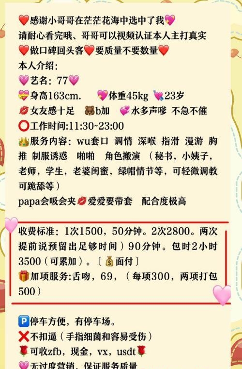 朋友介绍的,正好昨天没事去体验课一下!本狼不太会描述,就直接说点重吧! 妹子23岁,个子很高感觉比我还好点,大长腿身材好,打扮的是个御姐类型,服务很配合,臀部手感很好,屁股翘起来特诱人! 按流程进行的,服务中差点没忍住就去了,姿势配合,完了一点也不催人,不机车,妹子的确很不错!但有点高冷的感觉,但不影响我的心情!由于本狼不太喜欢SM重口味服务,所以服务做的常规全套服务!5张就是常规操作,不做sm这这价格可以优惠一张!但提前要和她谈好。 做sm就要加一张!这点必须好评!因为憋了好久了,和她做了很多姿势,下面水特别多,都流床单上了!妹子奶子很敏感,洗完澡就一直抱着吃大胸,把她整个人都亲软了,胸特别大,抓起来很爽BB很紧!操起来还有水声,叫声很好听! 这就是本狼的体验感受,总体来说除了有点高冷其它服务都不错!最后本狼强烈推荐!