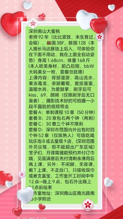 南山的巨臀老师,自己看课表再约吧,这个是特色菜,喜欢的再加,深圳卡戴珊,女上位磨棒超爽,颜值也不错,全程享受,可以随便怎么玩她的屁股的,吹箫完不急着进入她的小穴,先摩擦她的屁股,棒棒放进去差不多可以夹住,乳交也是超爽,F杯的巨乳,适合臀控,喜欢丰满的,每次去都要两次才过瘾,喜欢苗条的就不要加了,臀控爱死这屁股了,很骚很浪的,饱满的鲍鱼汁液很多,艹了一会让她女上位把大屁股对着我让她抽插,看着鲍鱼汁都拉丝了,流了好多水,是个骚货哦