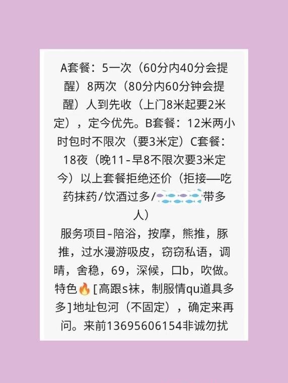 朋友介绍的,正好昨天没事去体验课一下!本狼不太会描述,就直接说点重吧! 妹子23岁,个子很高感觉比我还好点,大长腿身材好,打扮的是个御姐类型,服务很配合,臀部手感很好,屁股翘起来特诱人! 按流程进行的,服务中差点没忍住就去了,姿势配合,完了一点也不催人,不机车,妹子的确很不错!但有点高冷的感觉,但不影响我的心情!由于本狼不太喜欢SM重口味服务,所以服务做的常规全套服务!5张就是常规操作,不做sm这这价格可以优惠一张!但提前要和她谈好。 做sm就要加一张!这点必须好评!因为憋了好久了,和她做了很多姿势,下面水特别多,都流床单上了!妹子奶子很敏感,洗完澡就一直抱着吃大胸,把她整个人都亲软了,胸特别大,抓起来很爽BB很紧!操起来还有水声,叫声很好听! 这就是本狼的体验感受,总体来说除了有点高冷其它服务都不错!最后本狼强烈推荐!