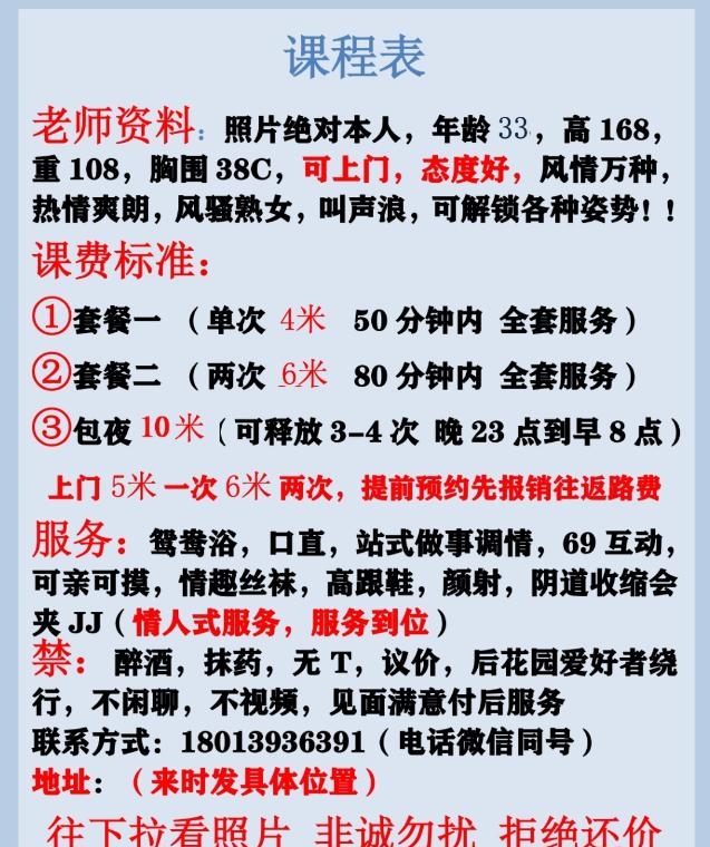 观望了两个星期,本人和照片一样,穿着制服丝袜高跟鞋迎接,长相过得去但年纪不大,身材均匀,还可以选别的项目角色剧情,新是站立口:老师会主动示意我固定她的头部让我自己动,光这一项太少了,有老师愿意,体验过就知道有多爽了,然后平躺口。接着老师上位,插入巨紧,冲击很强,有人被秒一点不奇怪,老师那股骚劲和屁股摇晃你懂得 ,换了两个姿势后大约123分钟缴械,刺激爽,性价比没得说,值得推荐
