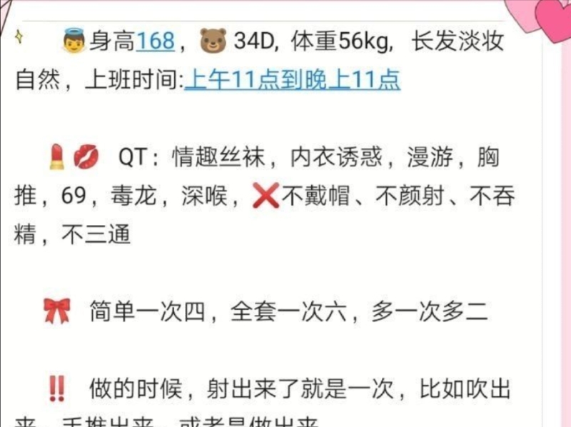 服务项目: 情趣丝袜 内衣诱惑 漫游 胸推 69 毒龙 深喉