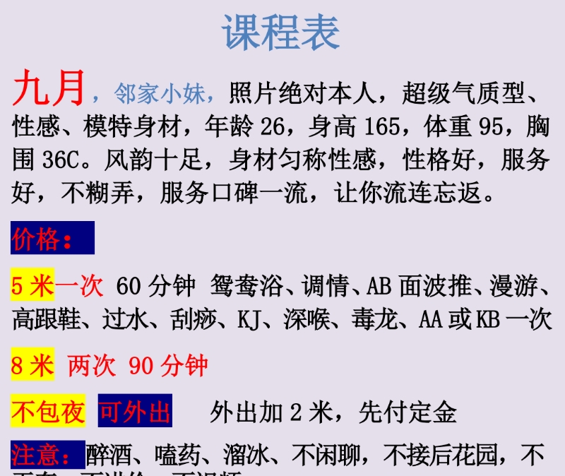 服务项目: 鸳鸯浴 调情 AB面波推 漫游 高跟鞋 过水 刮痧 KJ 深喉 毒龙 AA或KB一次