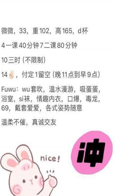 晚上有时间约到就过去了,开门穿着情趣内衣一对大胸进入眼前,白又大,然后就开始洗澡上床服务,胸大摸着手感很舒服,很软,我比较喜欢,服务也好,特别深喉,口特别舒服,姿势配合,不催人,环境也好很干净,人也热情,值得推荐。