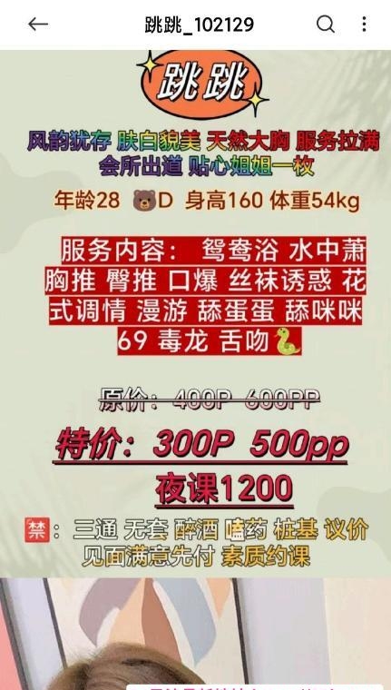 服务项目: 陪洗 胸推 臀推 漫游 水中萧 毒龙 舌吻 口爆 69 爱爱